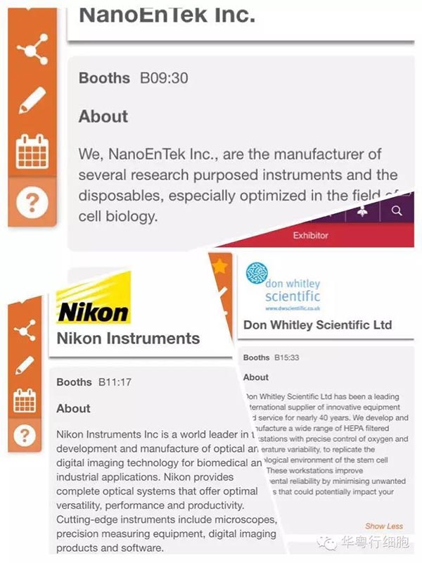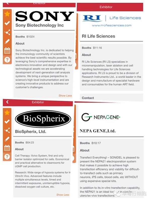 先看一下(xià)ISSCR會議APP上列出(chū)的部分廠家(jiā),一進入就看到我們的廠家SONY、Biosespherix、NEPA 、NanoEnTek